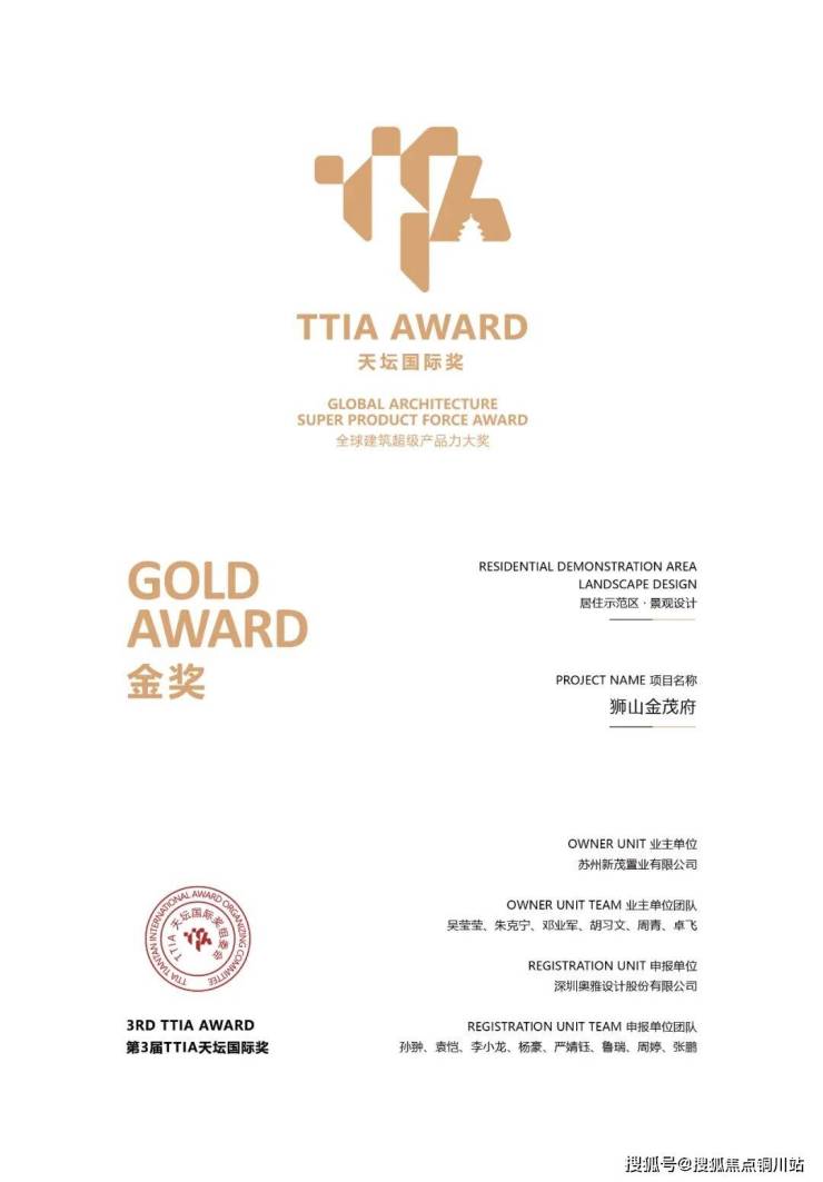 如果说国家级认证是对项目整体的肯定,那么第3届TTIA天坛国际奖(居住示范区·景观设计)金奖,则是对狮山金茂府在特定领域专业能力的极致认可。