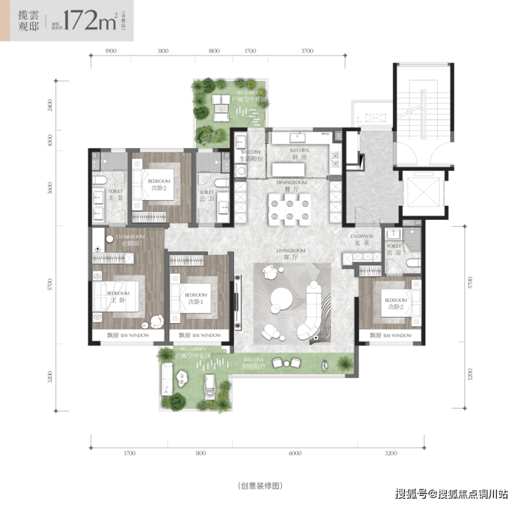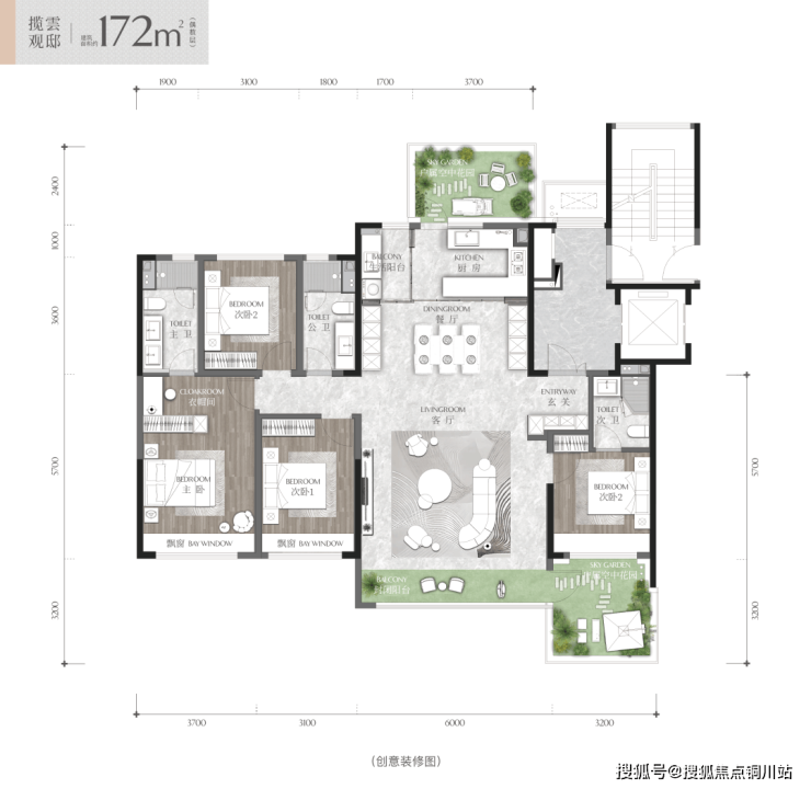172平的户型则对标市面上185平的户型,亮点是四面宽客厅6米大开间,南北双露台,都是方正实用的小院式露台。