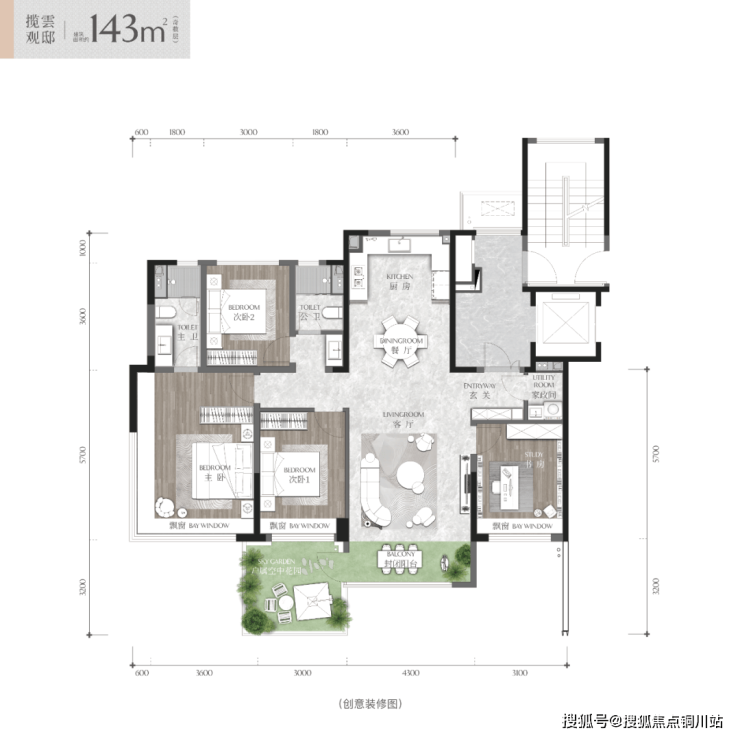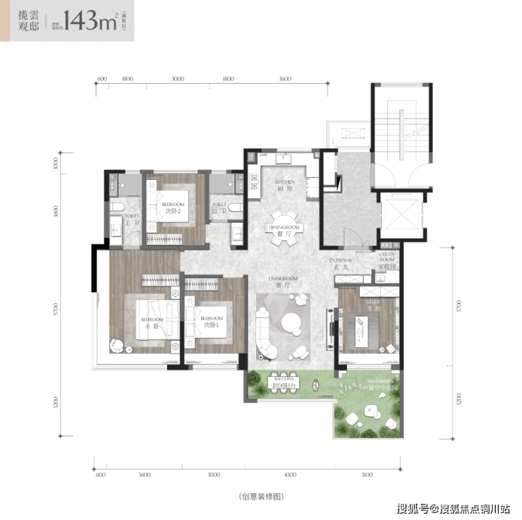 143平的户型可以直接对标市面上165左右的平层。除了独立电梯前厅、卧室飘窗等常规赠送外,还额外赠送一个方正实用的南向露台,进深将近3.2米,打破了常规细长的开敞阳台中看不中用的鸡肋设计,实现真正的空中庭院。