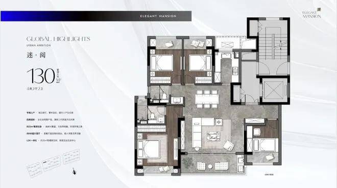 其中,130㎡户型有传统方厅和较多飘窗赠送,客厅宽5.7米;150㎡户型有5.6米横厅和8.6米双联阳台,私家电梯入户和独立入户玄关;186㎡户型在尺度上升级,做了3卫双套房设计;265㎡户型有5个套房设计,包含独立家政间和保姆房,客厅有270°转角阳台。