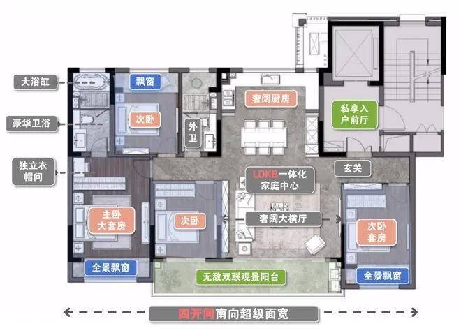 【户型亮点】全明设计,南北通透。5.7米的超大宽厅设计,市面上稀缺独有。4房型设计,可以满足三代人居住,高得房率+高赠送面积。