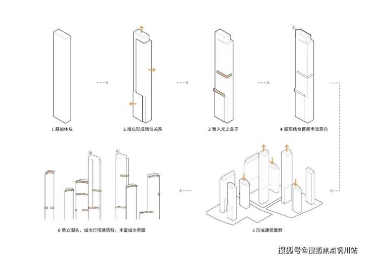 作为地标级的居住建筑,项目采用标识性的形式语言,充分提升小区建筑在城市中的辨识度。翩然起翘的超高层塔冠如同城市灯塔点亮高空,带有勇立潮头、扬帆千里的美好期许。