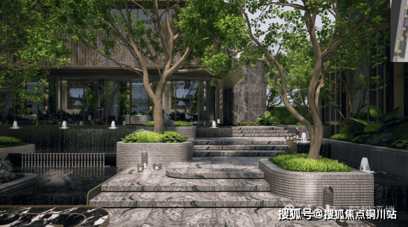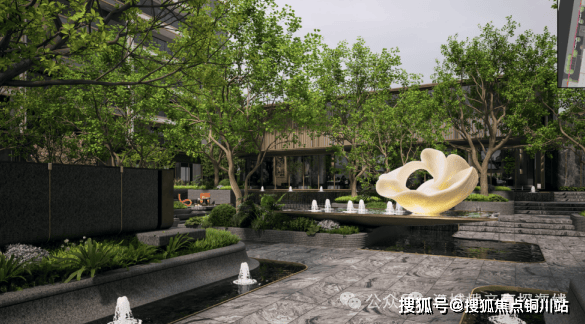 规划三重五景的园林,绿植、艺术装置、水景交叠。