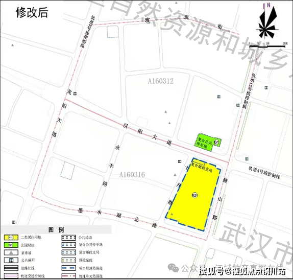 0.11公顷通信用地变更为居住用地复合通信用地(邮政支局);与居住用地复合利用的公共停车场调整至汉阳大道以北,与规划控制的公园绿地复合利用;取消街坊内东西向公共通道。