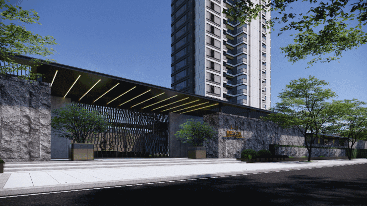 松阅用了约45m星级酒店式大门,最高约6m的艺术化景墙,同样精致的金属格栅,搭配一整面野奢酒店同款开山石,优雅金与高级灰,在私域与外界之间,划分出鲜明的领域感。
