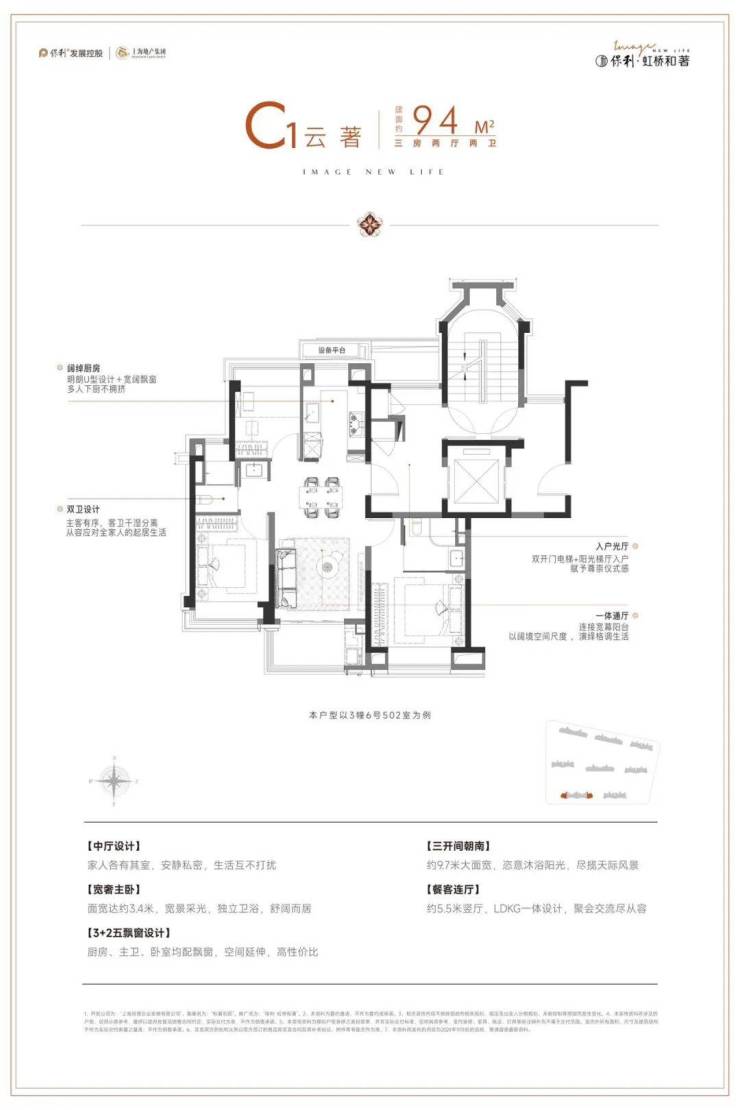 阳光梯厅入户、朝南三开间,铺就尊崇仪式感;U型厨房直连餐客连厅,款待客人相聚尽显从容;3+2五飘窗设计,会客休憩时有轻风相伴。