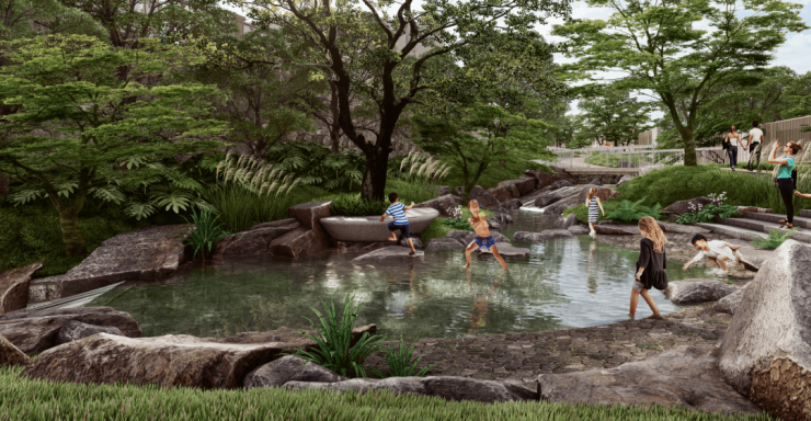 在连接南北区的带状土地上,设计定位是“九溪十八涧“,规划了亲水平台、跑道穿梭、童趣乐园以及春知学堂等。