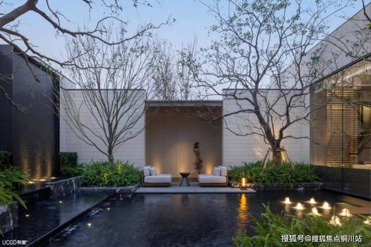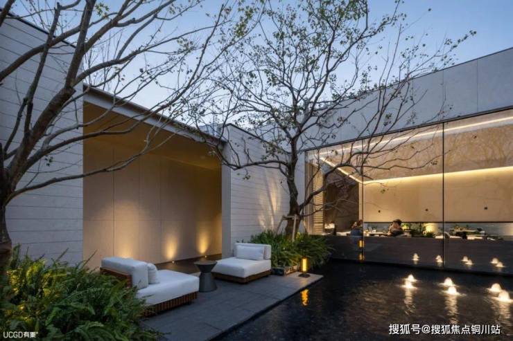 穿过接待前厅进入静心庭院。墙面围合,形成安静隔绝却又开放的私密空间。第二个庭院以动中有静、移步换景的苏式游园场景来布置空间格局。庭院、叠水、奢石、坐凳共同组合而成一个纯粹又自然的度假感现代庭园。
