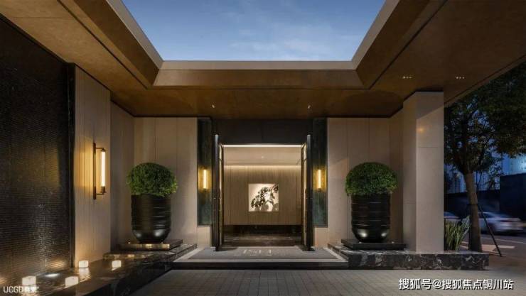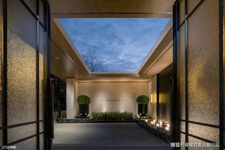 入口前庭是度假式生活的起点。璞拾胥江入口处的转角景墙仿佛一卷画卷,把嘈杂与喧嚣隔绝在外,营造出了尊享街区的领域氛围。第一个入口庭院引入了天光,将四方前庭打造成奢华又隐秘的酒店式入口。
