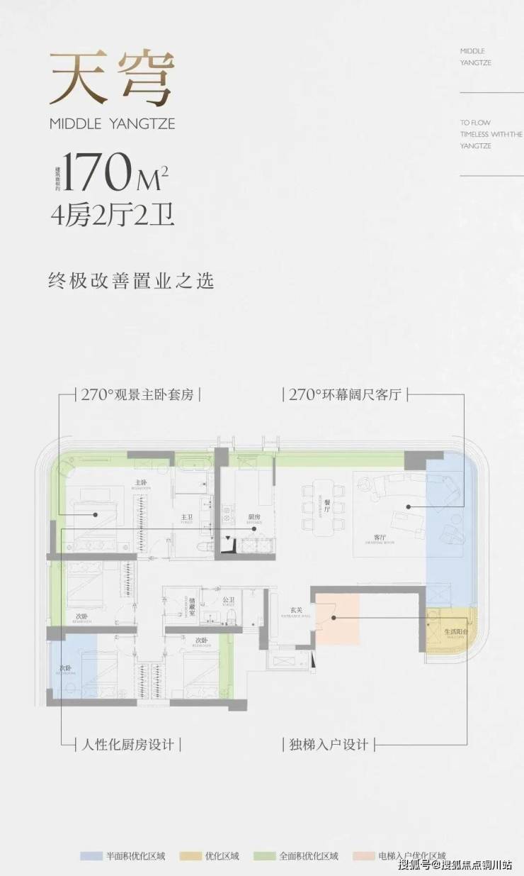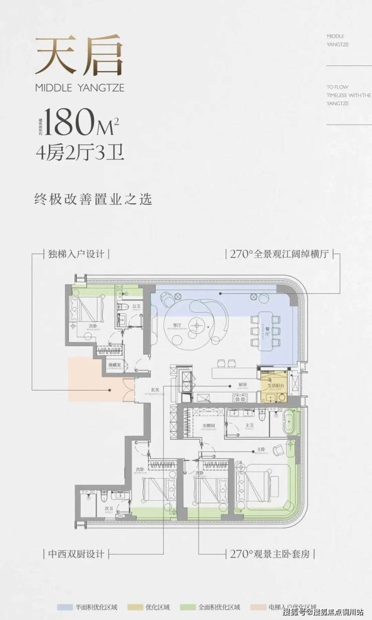 170㎡王牌户型,独梯入户,270°观景主卧套房与约8.5米宽环幕客厅;180㎡户型,270°观江横厅,约28.5米连续看江界面,双套房设计适合二胎家庭或三代同堂。