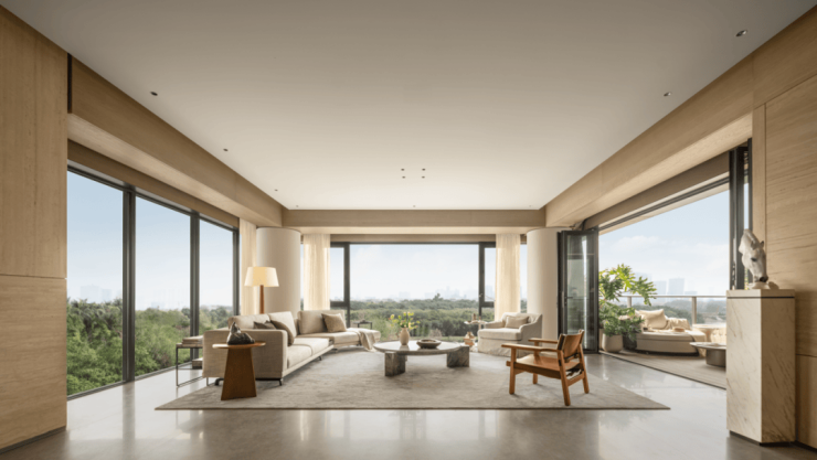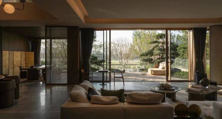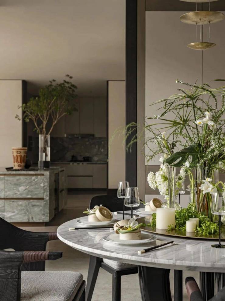 无独立柱设计的餐客厅一体化空间,以超10米南向面宽,引光为景,纳院为画。整墙落地玻璃将绿意延揽入室,模糊了建筑与自然的界限,也融化了人际的隔阂。