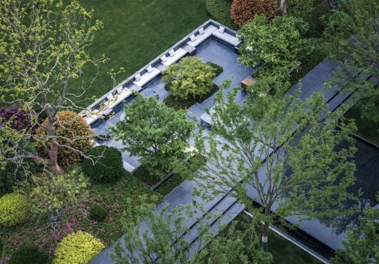 中央聚场结合美国建筑大师路易斯康落日广场的设计语言,四水归堂,水流静邃,8棵榉树矩阵,以中西式结合的设计手法,既显大气,更显格调。