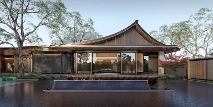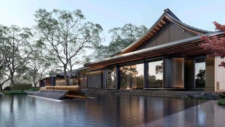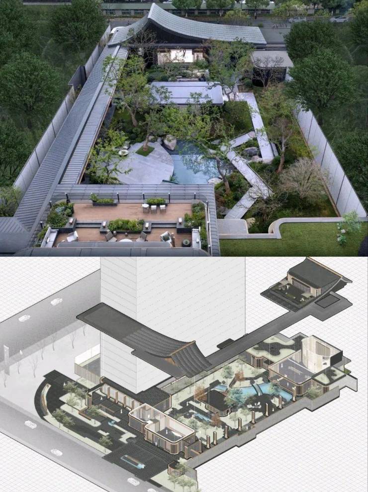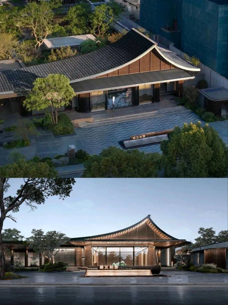 空间的灵感源自一幅“造园图”。连续的屋面,檐下灰空间的过渡,以及人在空间中的行为,共同界定着虚实。在朗云的整体布局中,从门堂到廊庑,从廊庑至售楼处,产生了实-虚-实的空间转换。