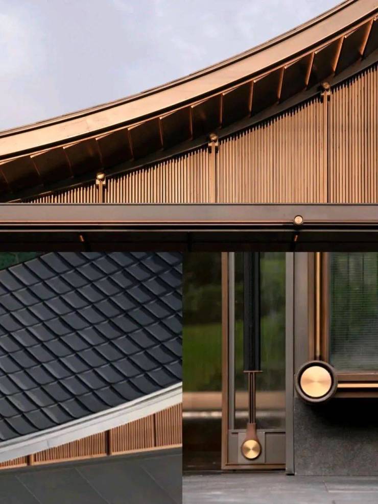 为契合“人”字主题,在建筑立面和材质细节的设计上,大多设置了曲线元素和倒角。鱼鳞状的瓦形纹是实心铝合金,它以叠加的形式藏于“人”字屋顶天花、铺在艺术廊道屋面、雕塑水流装置。