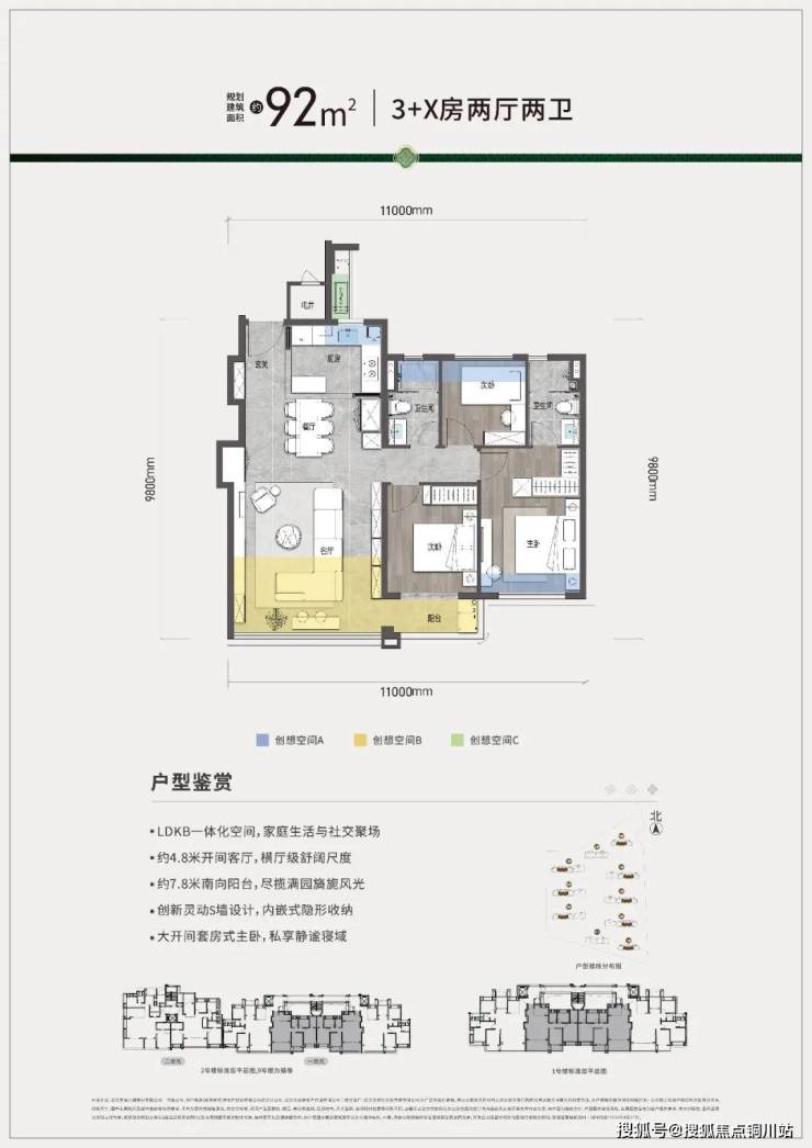 约92㎡户型,三房两卫,拥有着以往同级别面积几乎不可能出现的约4.8m开间大客厅
