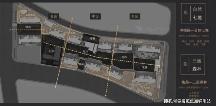 楼盘东西景观延秦淮河展开,打造了东园、中园、西园三个主题园林,以探山、归宇、寻菱、逐月 、穿林、迷谷、飞潇为主题的七大景观,其中: