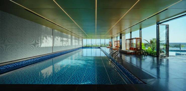 别人的健身房挤在角落,他专门规划一整层健身+瑜伽空间;别人有个室内泳池就号称“高端”,他直接打造室内外双泳池。