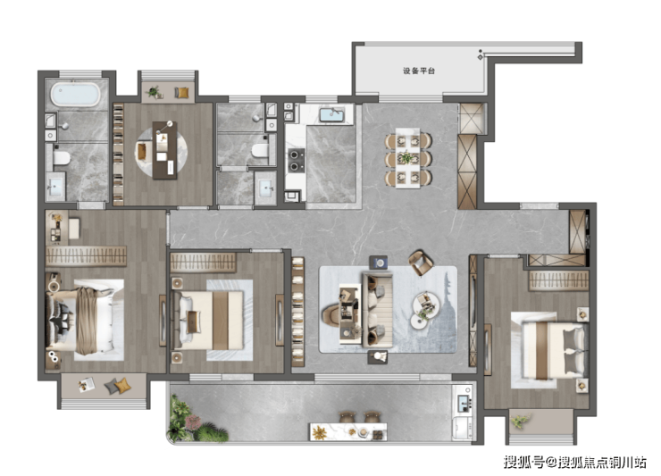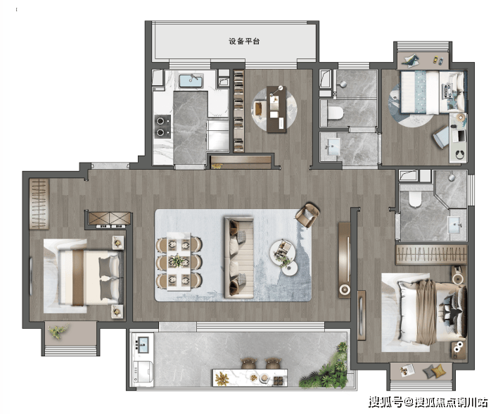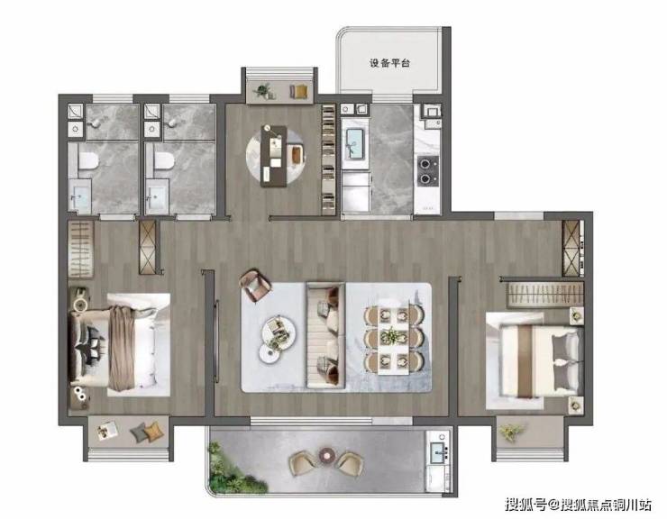 经典三叶草设计,房间分散布局,最大程度减少过道和闲置空间的浪费,整体利用率极高,让更多面积用于客餐厅、卧室等功能区,会客空间更为开阔敞亮。