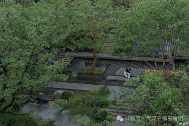 设门、台、水、亭四点成线,借鉴匠法于中央水景巧设全景会客厅,精择朴树、乌桕等名贵植株,引入樱桂枫梅等四季花木,打造立体多维水景园林。