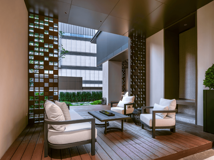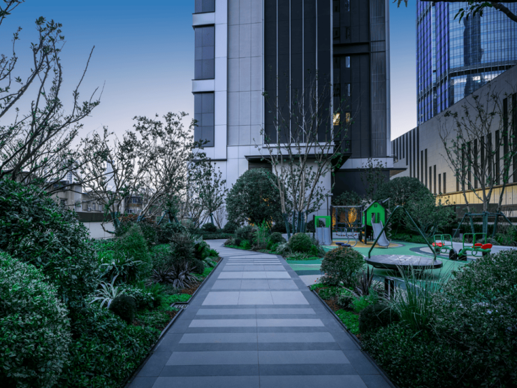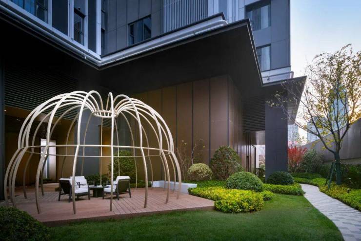 步入园林之中,空中花园被打造成富有生态感的漂浮岛屿,主题庭院通过不同材质转换,设计铺装结合地形、光照条件,打造园林移步异景之美。