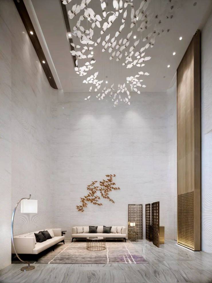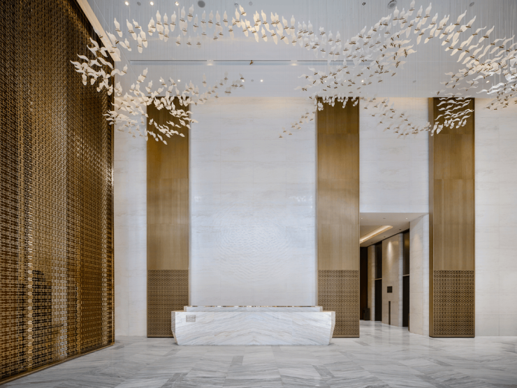 让每一次归家,犹如置身幸福旅途。武汉幸福里营造兼顾仪式感与功能性的“归家最后一公里”,归家大堂以江水和飞鸟为元素,复刻武汉老码头印象,横向线条肌理石材、立体水波纹雕刻背景墙、红色皮革板、温暖的镂刻图案木饰面、暖白大理石,交织出温润的归家场域。
