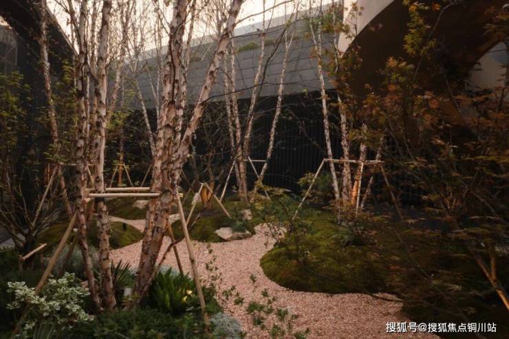 瑞士户外家具品牌Garden系列的Sponeck椅子,Sponeck脚凳;富有张力的不规则环状形态,为空间增添高级质感与松弛感;白桦林勾勒出轻盈的天际线,下层花镜适当留白,为未来可能性预留生长的空间;