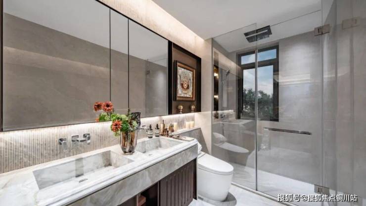 双手盆设计完美解决了晨起洗漱的空间矛盾,配合镜柜收纳系统,实现功能性与空间美学的平衡。