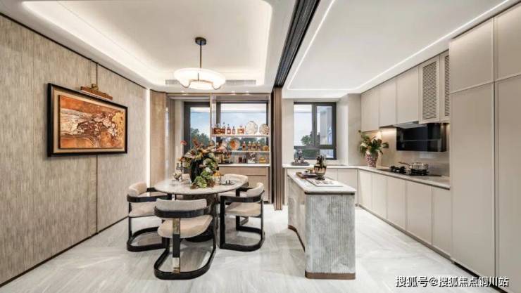 餐厅、厨房规划为统一的空间之中,营造更便捷、温馨的就餐空间,并与北侧的开敞阳台形成联动,为饭后休闲提供了全新的场景。