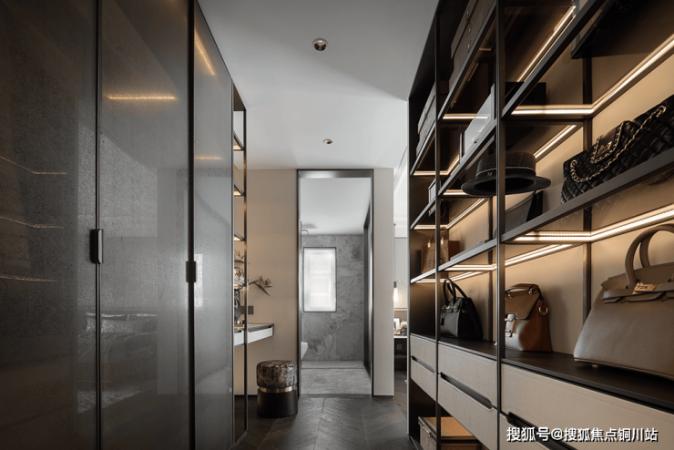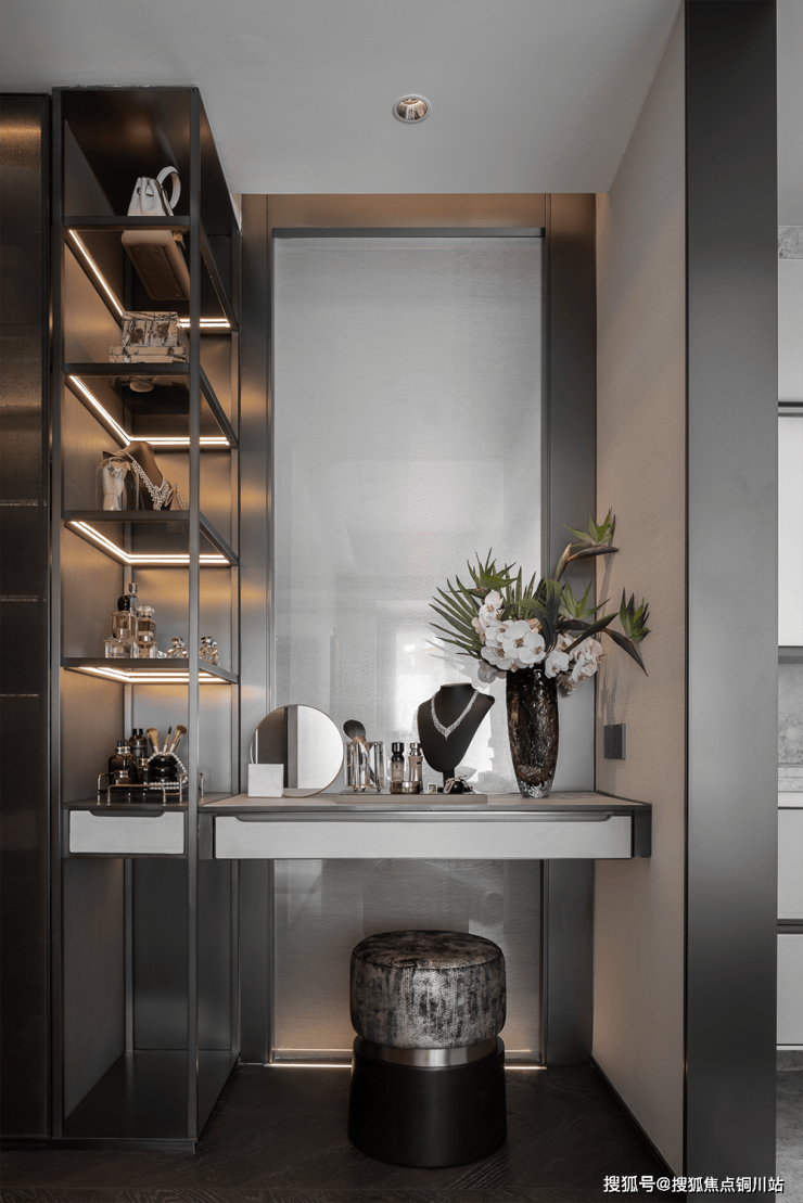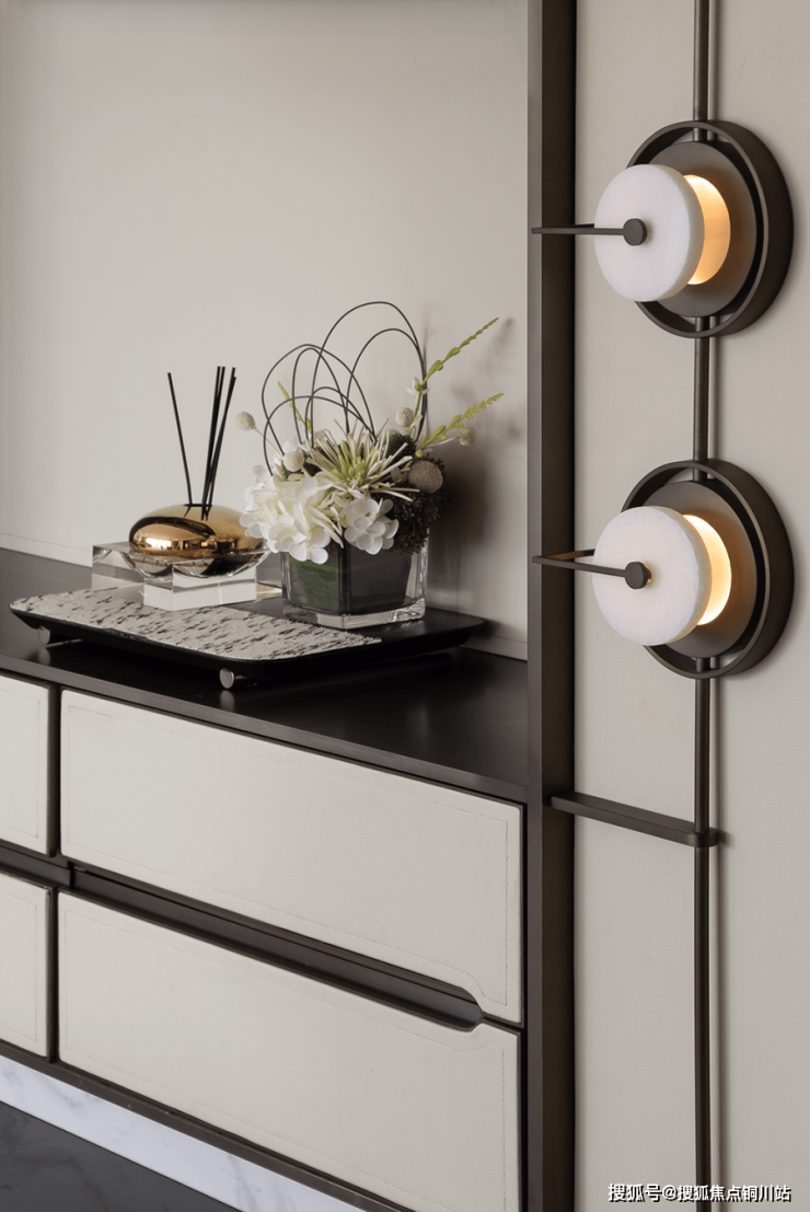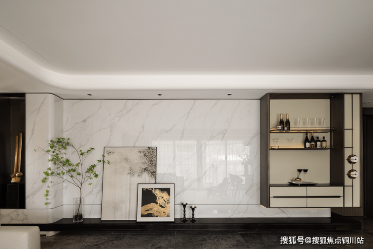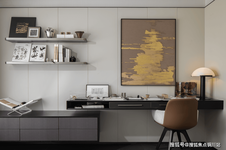 书架高低错落,暗示层次;古铜饰线,映衬木质面层板,碰撞出简奢的空间调性。