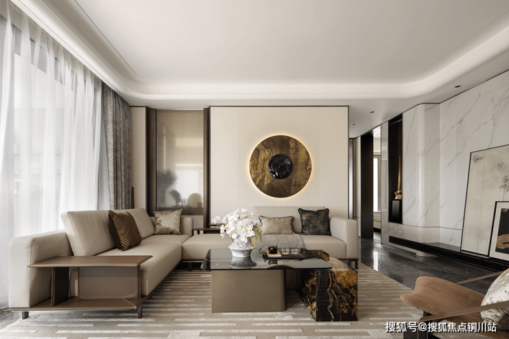 大理石地面满铺延伸,肌理润泽;米色硬包墙面含蓄内敛,应和圆润天花的流畅造型。