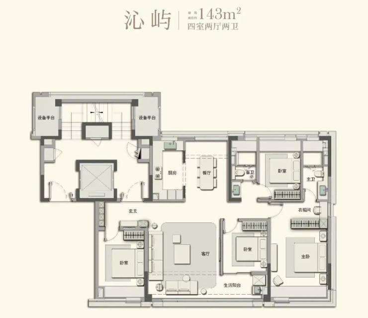 建面约143㎡四房两厅两卫,拥有不少200㎡都没配置的南北双阳台,独立餐厅+北阳台,让欢聚时光被窗外美景包裹;南向双联阳台,与宽境客厅联动,生活更新鲜;四间卧室都可容纳床+双床头柜+衣柜,达到舒居标准。此外,5个飘窗均不计入产权面积。