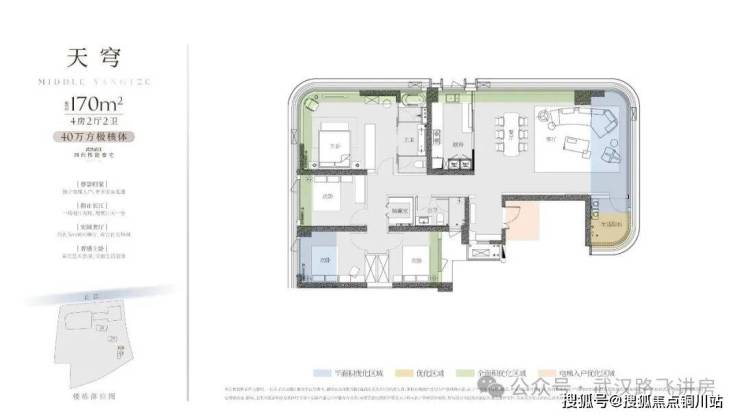 ③170㎡户型:四房两厅两卫,整个户型的布局与江面基本平行了,对比3号楼另外两个户型,170平户型的看江效果要优秀不少,客厅(270度观景)、主卧、主卫、厨房这几处空间都拥有不错的江景视野,观景面还是比较可观的。不过为了看江,这个户型的进深做的比较大,通透性稍显不足。