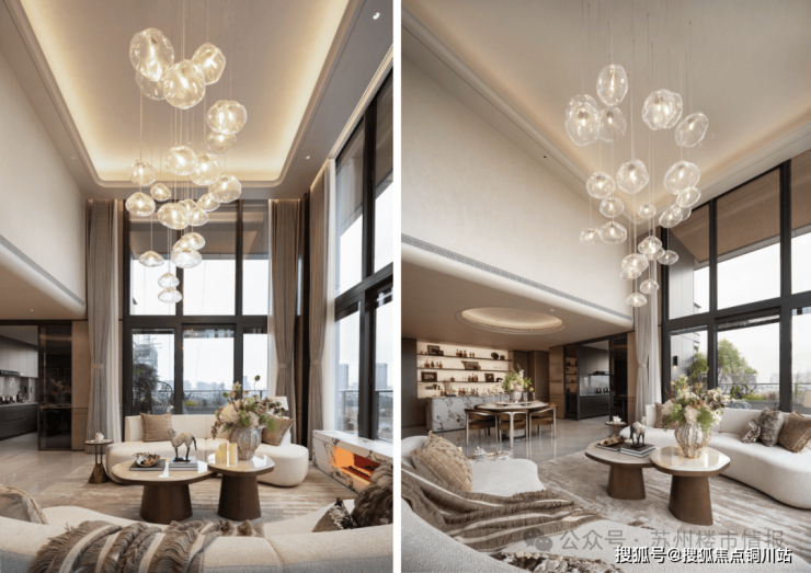 约6.6米的客厅挑高,带来超大尺度的气派感,将别墅的垂直尺度与大平层的横向尺度融合,创造平层“墅居”生活感受,既有墅级的高度又有大平层的平面尺度。