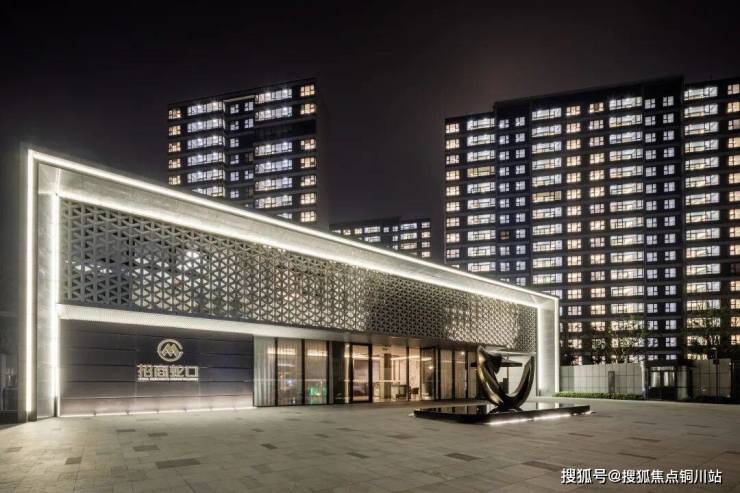 社区的落客大堂颇有五星级酒店的感觉,大面积亮银色编织网格栅,搭配珍珠蓝石材打造立面,门前还有艺术雕塑及水景,仪式感满满。