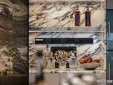 三大奢石配置(玄关白金沙/白雪公主岩板、客厅蓝翡翠岩板、卫生间卡里冰玉石材)点缀空间。