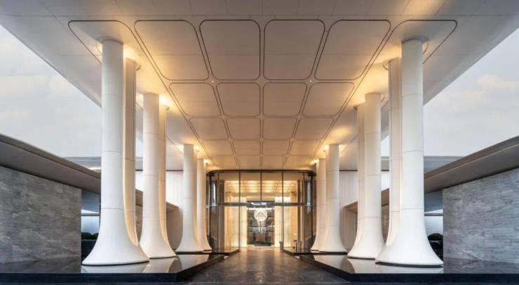 入口处,8根纯白巨型立柱,将大堂空间向上整体托举至10.5米的高度。无论是天光倾泻,还是夜幕低垂,圆与方、天与地,都形成一种极具冲击的空间秩序感。