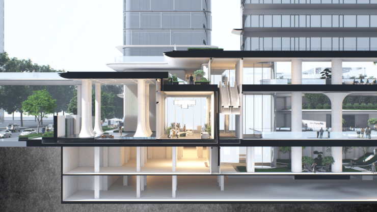 以“竖向枢纽”为动线,项目通过飞梯与公共交通,将住区的宁静、万象城的繁华、空中会所的私享,以及公园街区的艺术气息编织在一起。这种深度又微妙的互联互渗,正是“超级底盘”的精髓所在——它让建筑不再是一个孤立的点,而是与城市网络紧密咬合、互为补充、共同进化的有机体。