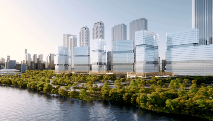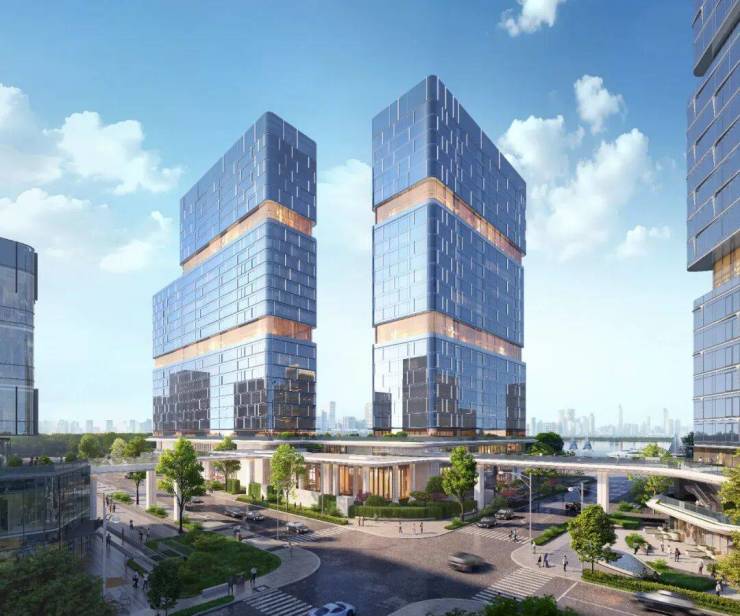 由C1、C2和C3地块组成的建筑群,如八面水晶屏风依江错落展开。外立面建筑造型灵感,从宋代马远《十二水图》中的《长江万顷》汲取灵感。建筑团队将水墨画中江流的动态走势、虚实节奏与留白意境,转化为立体的建筑语言。