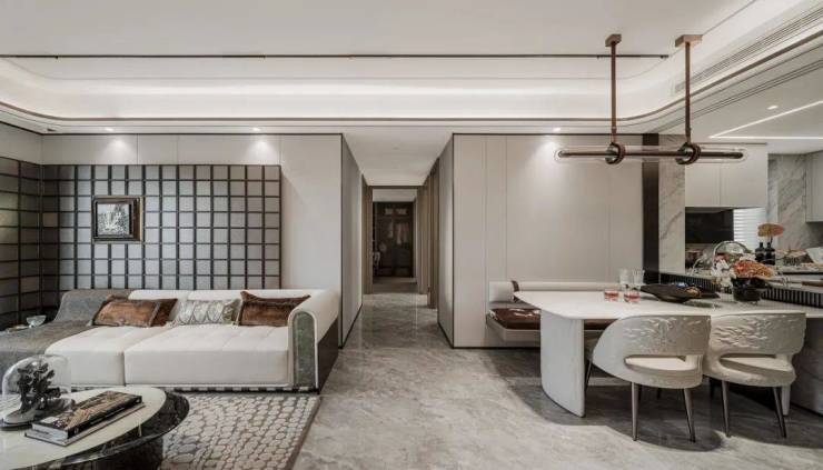 电视背景墙采用仿石岩板和纯铜材质组合,细节之处彰显奢华品质;