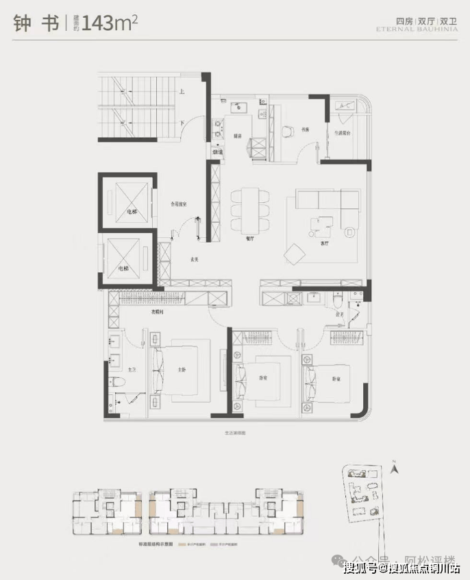 不过同样主卧靠近门口,且与紧邻电梯井,餐客厅一体面积并不算大,180平建面也没有做到三卫。