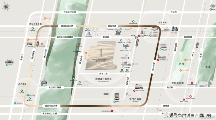 总建筑面积约163万方。地下城市环路、地铁枢纽;地面,月亮湾城市阳台与城市公园;地上,武昌万象城、约380米“长江之琴”的城市地标、“武汉长江中心”高端住宅群、“长江天际”商务大平层等。