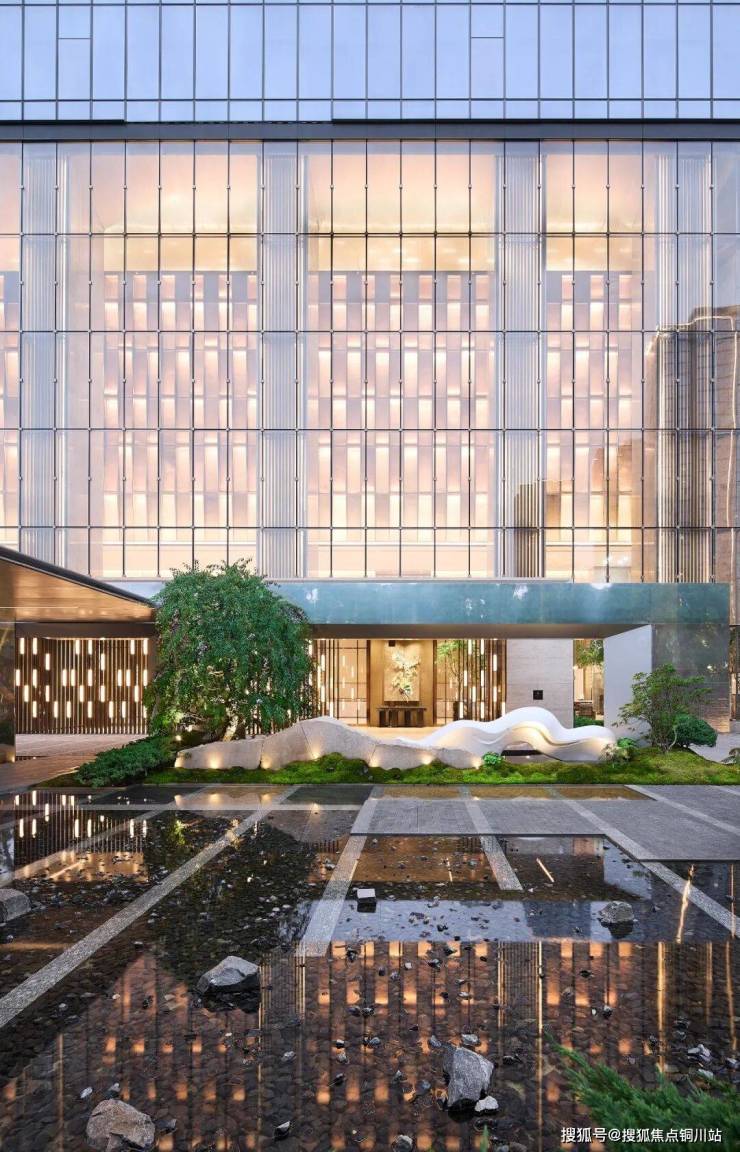 挑高约24米的酒店式大堂,由198块全面屏超白玻围合,编织灯笼造型设计,气势磅礴。