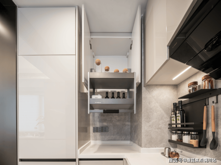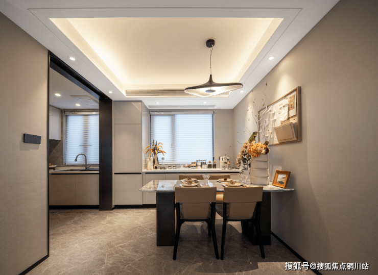 「餐边柜」:一体化餐边柜,石英石台面设置滴水线,可作为厨房延伸段,分区储物可作为家庭收纳柜,内置卡萨帝冰箱,大空间独立储物;