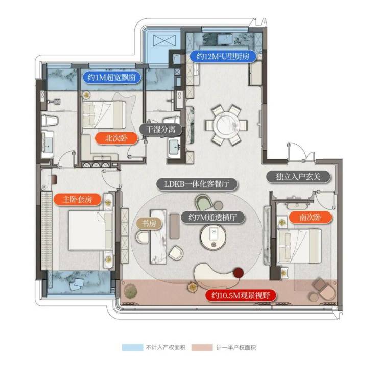 采用LDKB一体化设计,约10.5M宽厅格局,中西厨岛台,营造超级家庭公区,将世家大族的风范于此彰显。同时还设计了人性化的老人套房、约76㎡私家庭院。