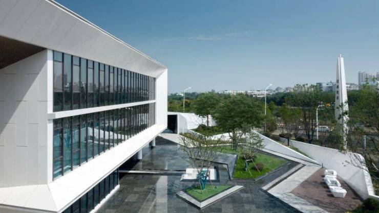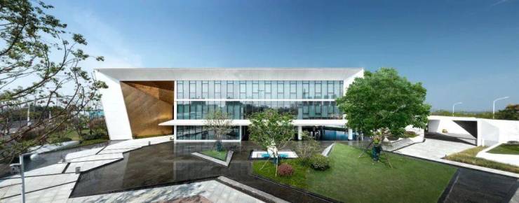 每当夜幕降临,公园内将会亮起一只眼睛。展示中心:我们打开了向东沿湖一侧的建筑界面,并在前场营造了后官湖岸整条绿道的核心节点,景观直接向建筑内部延伸创造无界化空间。