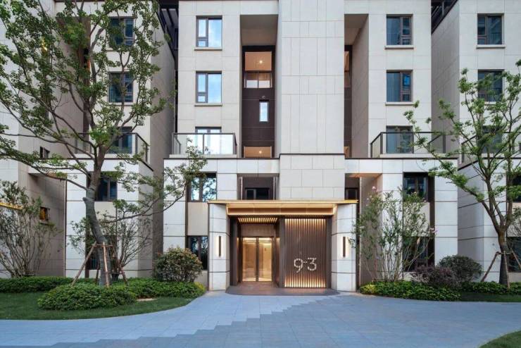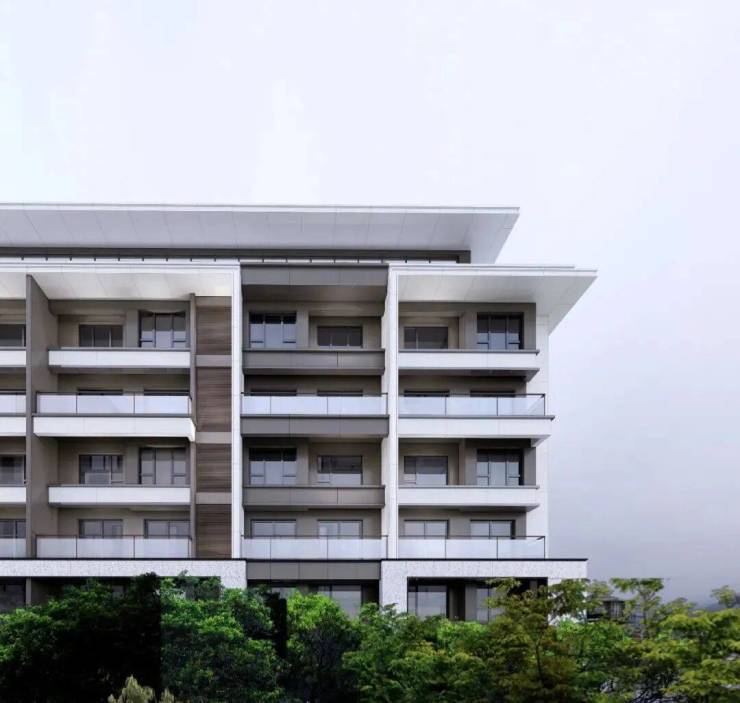 在高层及叠墅的山墙两侧实体面居多,考虑到过于单一的材质质感会让立面显得乏味。因此,我们在山墙面增加了涂料使得形体层次更加清晰丰富。而为了提升涂料面的精致度,仿石涂料面通过有韵律感的分缝设计,以及不同仿石纹理的反复挂样推敲,最终在次要的山墙面用涂料做出了石材般质感的外观效果。