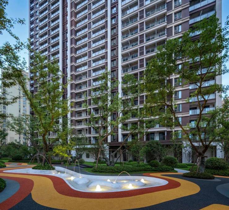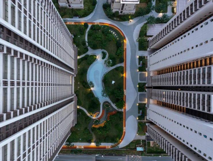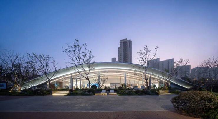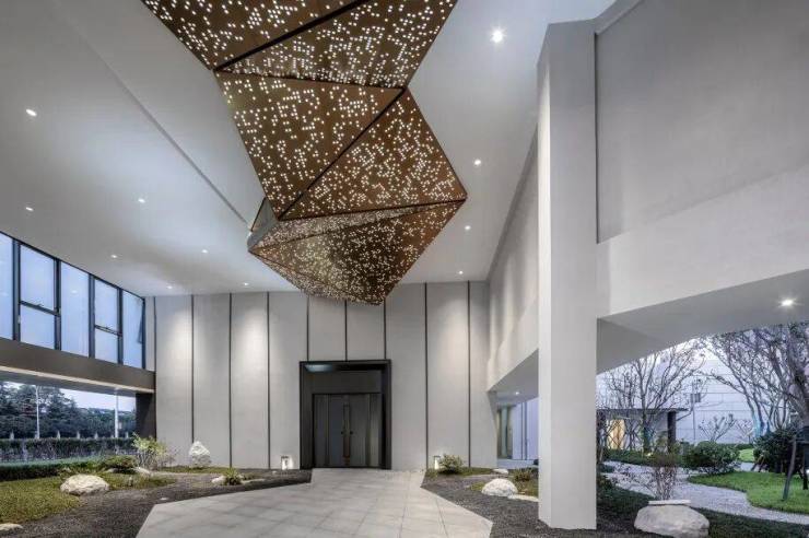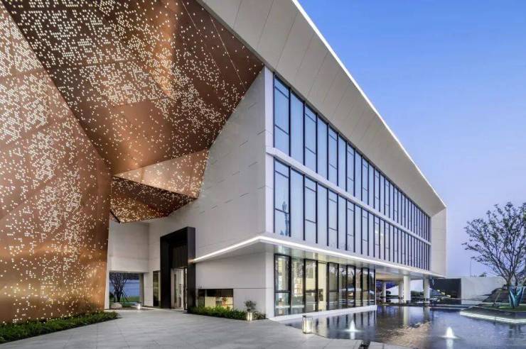 设计过程中,我们通过空间的重构、镜面等光线的影响、材料的使用、流线的引导,对建筑设计方向的把握以及三重亲水体验的处理,让每个来到的人都能身临其中,感受水岸生活度假场景。由此住宅与湖墅、展示中心及售楼处形成整体大区链接,以多元复合的空间功能和场景,打造情感依托、社群联结的栖息目的地。