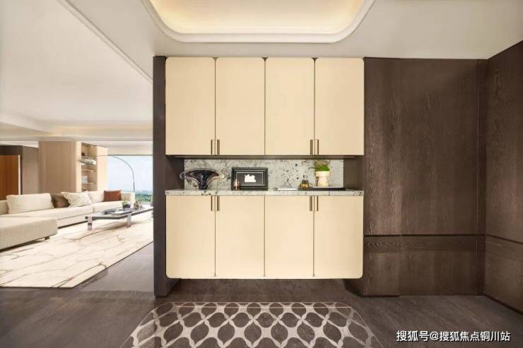 设计师还巧妙利用“横向延展+纵向通透”的复合策略,将传统豪宅的“厅室分离”升维为“无界交互场域”——父母在厨房备餐时可与客厅玩耍的孩子互动,书房与客厅的玻璃隔断则兼顾办公隐私与家庭陪伴。