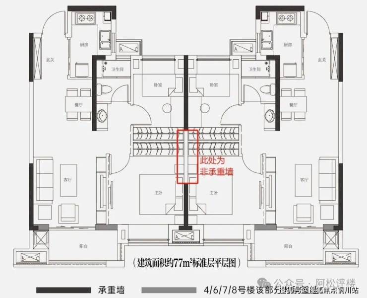 其次,该项目两个户型之间的墙体提前预留了非承重墙,因此后期才可进行拆除完成户型拼接。