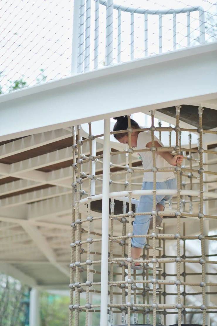 两侧的攀岩坡道,能够锻炼孩子们的勇气。成长就是不断攀爬向上的过程,累了停下歇歇也没关系,半路的风景也不错。